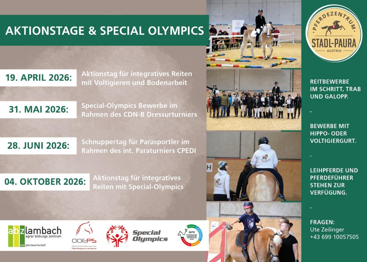 Die Aktionstage & Special Olympics 2026 bieten Menschen mit und ohne Beeinträchtigung die Möglichkeit, den Pferdesport in einem sicheren, unterstützenden und wertschätzenden Rahmen zu erleben. Im Fokus stehen Inklusion, Freude an der Bewegung und gemeinsames sportliches Erleben.