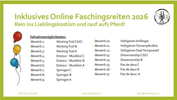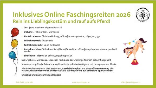 Das Online Faschingsreiten findet von 1. Februar bis 1. März 2026 statt und wird im eigenen Reitstall durchgeführt. Die Teilnahme erfolgt per Video und ist für Teilnehmer:innen aus ganz Österreich offen. Alle Bewerbe werden in die Kategorien „Special Olympics“ sowie in eine offene Wertung für Nachwuchssportler:innen ohne Lizenz eingeteilt. Die Teilnahmegebühr beträgt 15,00 € pro Bewerb.