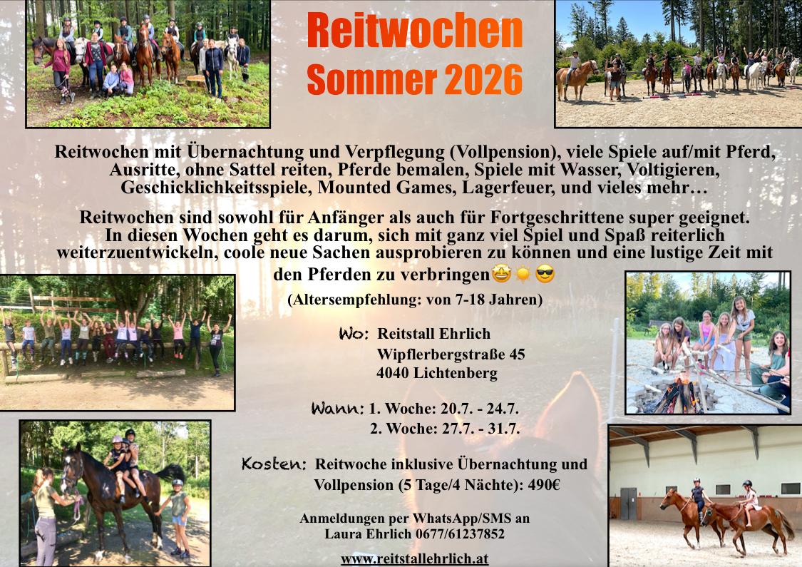 Reitwochen mit Übernachtung und Verpflegung (Vollpension), viele Spiele auf/mit Pferd, Ausritte, ohne Sattel reiten, Pferde bemalen, Spiele mit Wasser, Voltigieren, Geschicklichkeitsspiele, Mounted Games, Lagerfeuer, und vieles mehr...